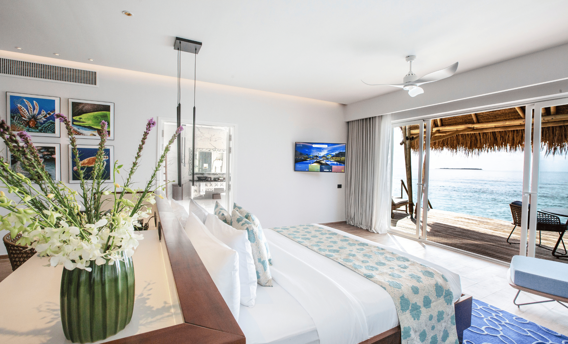 The one-bedroom Water Villa with Pool accommodates 128 sqm of space and includes a patio with private pool as well as direct access to the house reef.