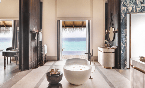 These 102-square-metre overwater villas boast a sundeck and a large infinity pool overlooking the lagoon. Inside, there is a luxurious round bed overlooking the lagoon and a round bath tub in the bathroom. Perks include direct check-in, free dine-around in all restaurants and a special evening turndown service every night.