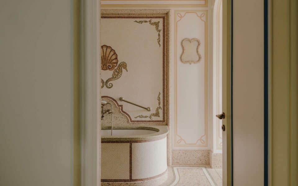 The hand-painted walls in cool watercolours and black and white marble floors create a stylish backdrop for a refreshing aperitif in the Cocktail Bar.