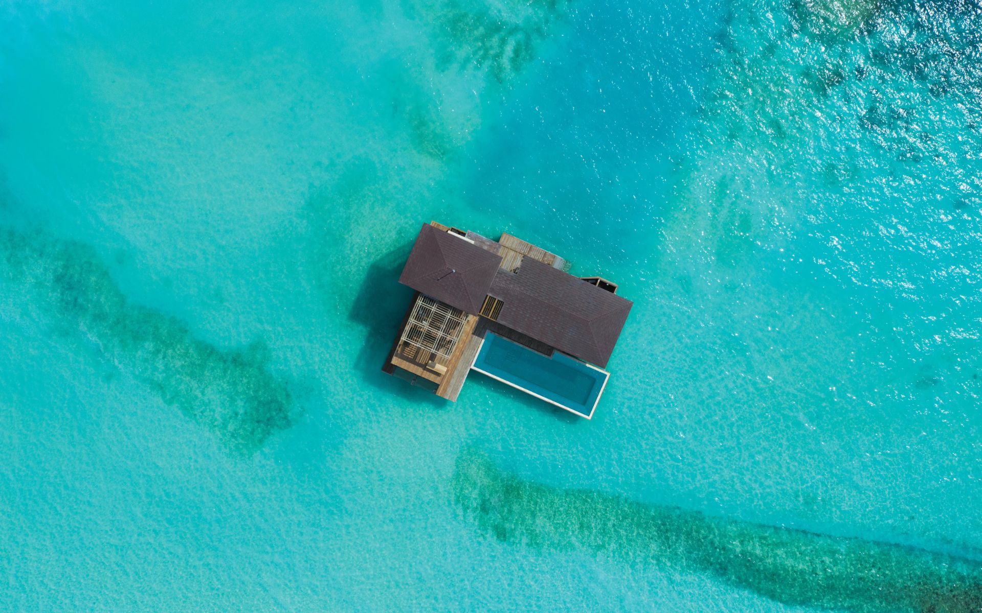This 279-square-metre villa boasts an infinity pool, direct ocean access, a daybed and overwater hammock. Inside, floor-to-ceiling windows lead to a bedroom with king-size bed,
